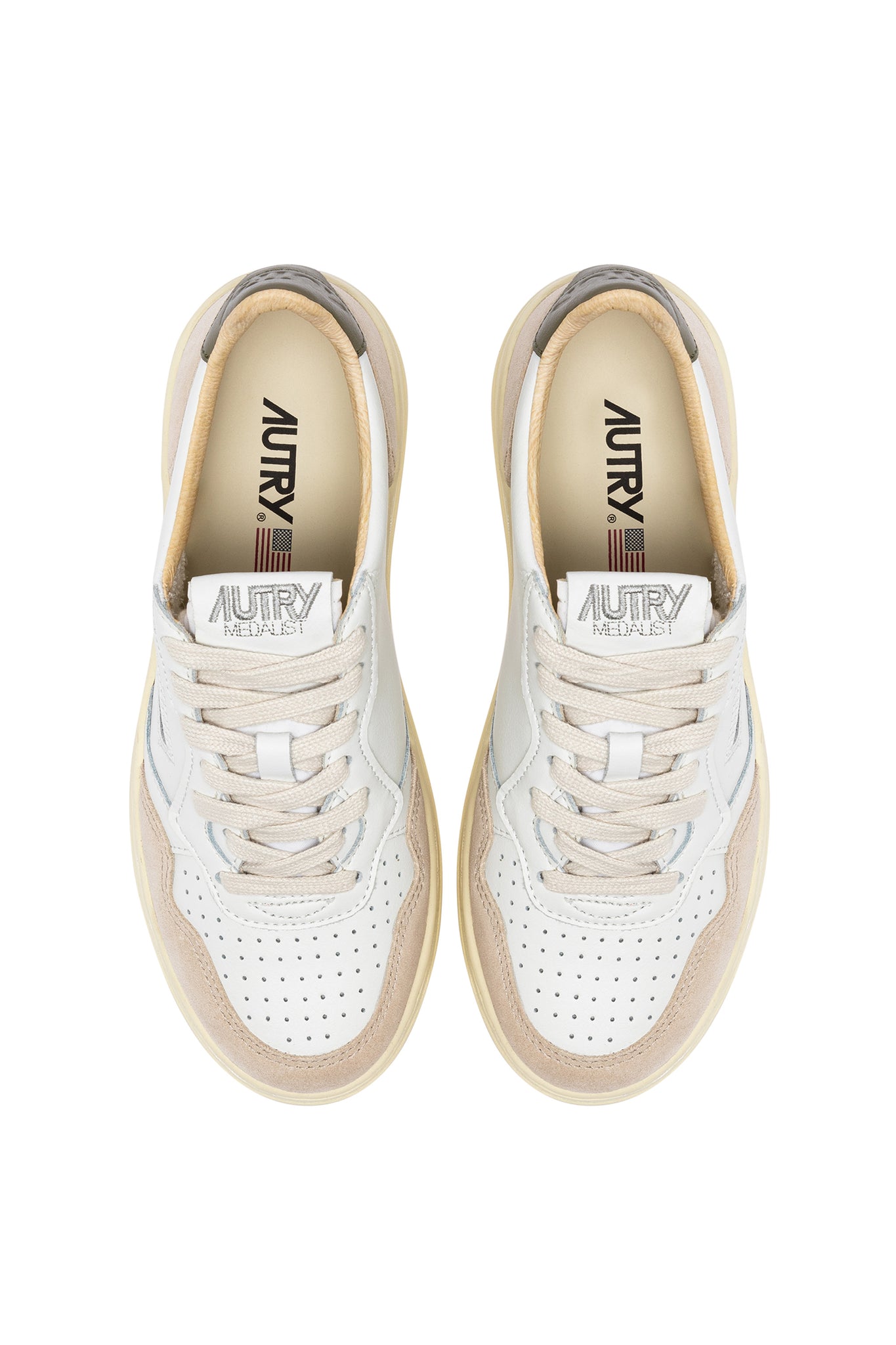These unisex sneakers are crafted in soft white leather with a supple, genuine look and feel, enriched with beige suede panels that lend the design a distinctive finish. The black leather heel tab is branded with the Autry logo.