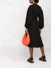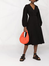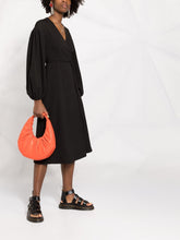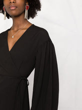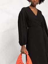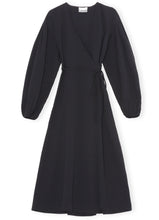 Black stretch recycled polyester-blend wrap-style mid-length dress from GANNI featuring wrap design, V-neck, drop shoulder, belted waist, long puff sleeves and mid-length. POSITIVELY CONSCIOUS: GANNI measures the carbon footprint of every item, and on each you'll find the Climate Compensated label, showing they've covered the cost to make that footprint carbon neutral..
